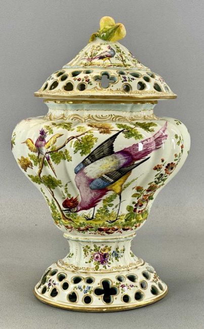 PAIR OF OVOID CENSER VASES with reticulated bases and covers, having fruit finials, bodies painted with exotic birds, gold anchor marks to bases, 35cms (h)Provenance: The Cornelia Bayley Collection from the historic Welsh Jacobean house, Plas Teg, Flintshire. Further auctions to follow including Plas Teg Principal Interiors, further details on this important Jacobean house and its clearance Welsh House Clearance of a Generation — Rogers Jones Co