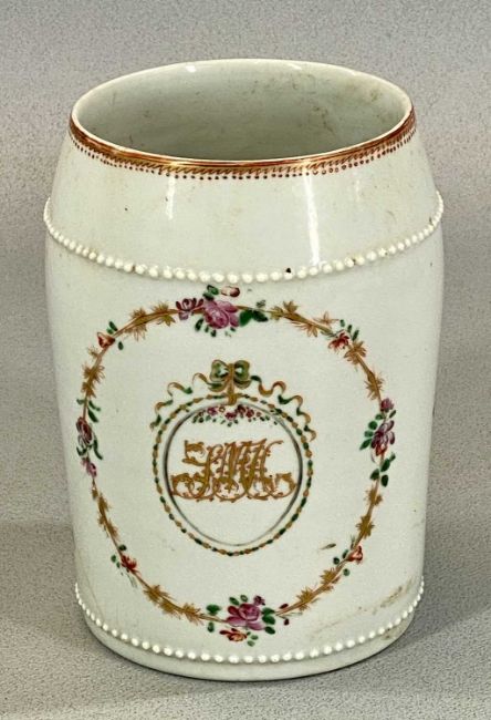 ASSORTED CERAMICS, comprising 19th century Chinese porcelain oval famille rose bowl, 7 (h) x 28 (w) x 23cms (d), Imari style octagonal plate, 23.5cms (diam.), and barrel form tankard with beaded bands, painted with floral sprays and garlands, indistinctly monogrammed (lacking handle), 15cms (h)Provenance: The Cornelia Bayley Collection from the historic Welsh Jacobean house, Plas Teg, Flintshire. Further auctions to follow including Plas Teg Principal Interiors, further details on this important Jacobean house and its clearance Welsh House Clearance of a Generation — Rogers Jones Co