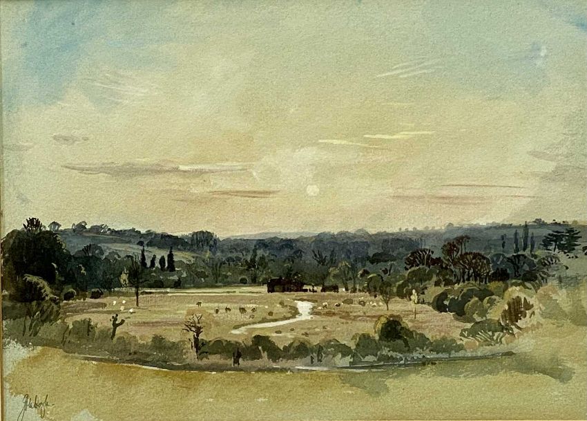 JOHN DOYLE ARWS two watercolours - 'Sunset Over the Itchen Valley', dated 1982, 27 x 38cms, and 'Non-Licet Gate, Winchester College', 17 x 24cms, St Peter's Gallery Winchester labels versoProvenance: private collection DenbighshireComments: both framed and glazed