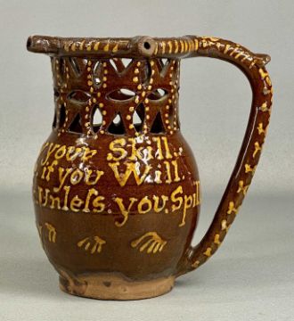 SLIPWARE RETICULATED PUZZLE JUG, possibly Buckley c. 1870, with motto 'Gentlemen now try your skill, I'll hold you sixpence if you will, don't drink unless you spill - Mary', 18cms (h)Provenance: private collection Conwy