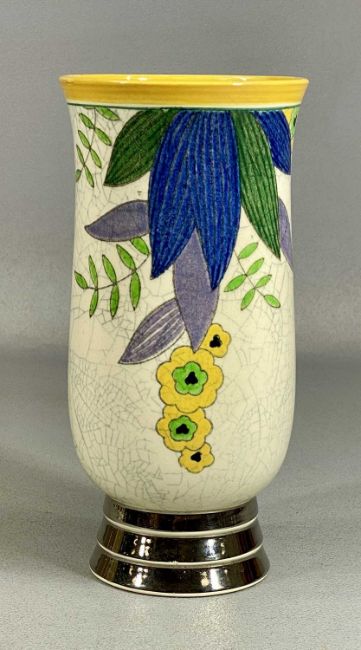 ROYAL DOULTON ART DECO VASE D5619, yellow banded rim, body decorated with trailing flowers on a cream crackle glaze design, base with three silvered bands, green printed backstamp, 20cms (h)Provenance: private collection Conwy