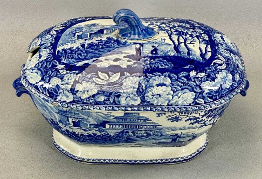 19TH CENTURY BLUE & WHITE TRANSFERWARE ITEMS, including rare large indented meat plate with gravy well, decorated with mythological Neptune scene and possibly portraits of Nelson, together with a tureen 36cms (w), and another smaller, 18cms (w)Provenance: The Cornelia Bayley Collection from the historic Welsh Jacobean house, Plas Teg, Flintshire. Further auctions to follow including Plas Teg Principal Interiors, further details on this important Jacobean house and its clearance Welsh House Clearance of a Generation — Rogers Jones Co