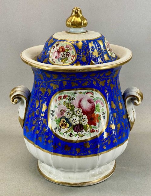 19TH CENTURY IRONSTONE TWO-HANDLED LIDDED VASE, cream and powder blue ground painted with floral bouquets, 43cms (h)Provenance: The Cornelia Bayley Collection from the historic Welsh Jacobean house, Plas Teg, Flintshire. Further auctions to follow including Plas Teg Principal Interiors, further details on this important Jacobean house and its clearance Welsh House Clearance of a Generation — Rogers Jones Co