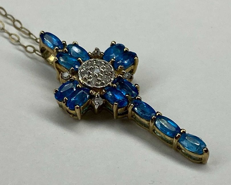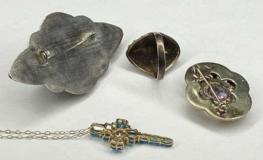 ASSORTED JEWELLERY, including 9ct gold stone set crucifix with fine link chain, yellow metal open work brooch set with pale amethyst, white metal brooch set with opaque blue stone, and white metal helmet shaped ringProvenance: private collection Conwy