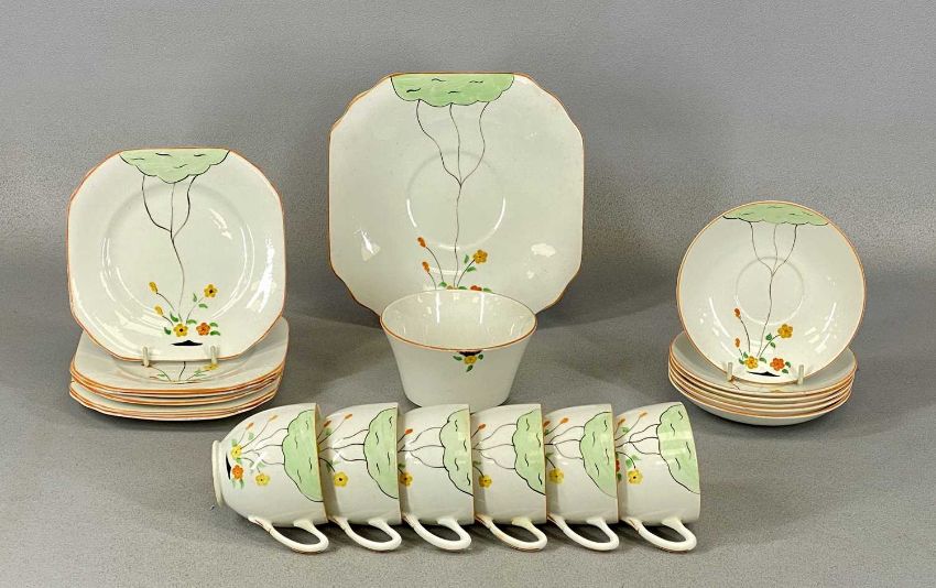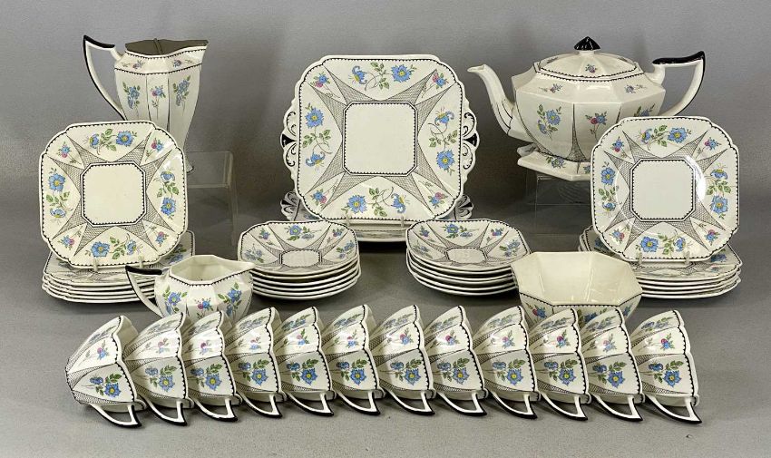 ASSORTED TEAWARE, including Shelley octagonal form tea service, pattern 11477, including teapot and hot water jug, 35 pieces; another Shelley Blue Iris F11561 pattern tea service, 28 pieces; and Art Deco floral part tea serviceProvenance: private collection Gwynedd