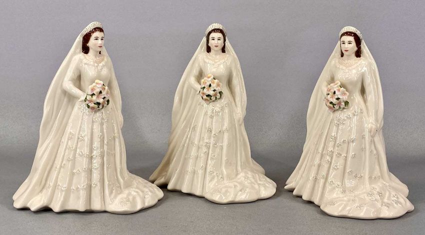 FIVE ROYAL WORCESTER FIGURES, three Queen Elizabeth II 'Diamond Wedding Anniversary 1947-2007' figures, and two figures 'In Celebration of The Queen's 80th Birthday 2006, Dressed in the Robes of the Order of the British Empire'Provenance: private collection Conwy