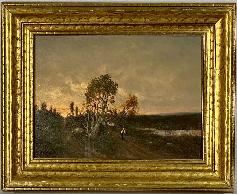 OGILVY (British 20th century) oil on board - country lane at sunset with figure in foreground, signed lower left, 30.5 x 40.5cmsProvenance: private collection DenbighshireComments: framed