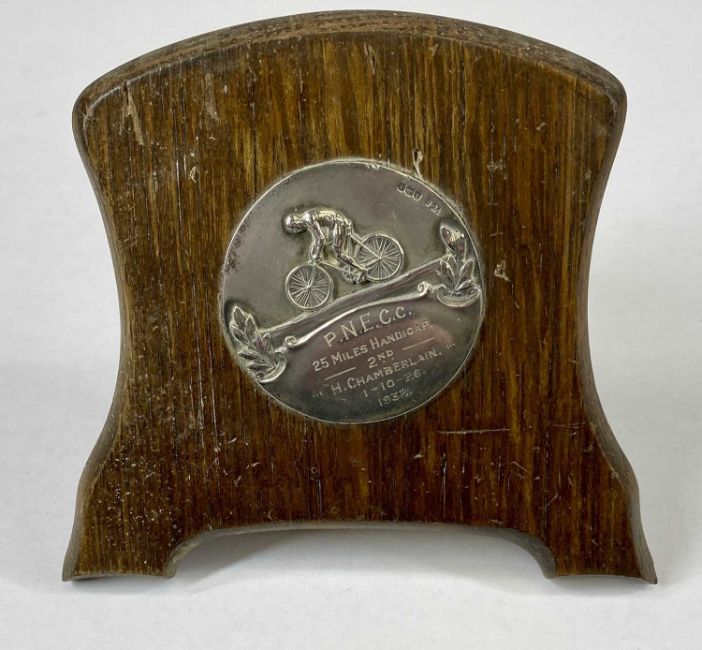 CYCLING INTEREST: COLLECTION OF SILVER / METAL & ENAMEL MEDALLIONS, Portsmouth North End Cycling Club and News of the World Victory medal, dating 1920s, mounted on a silver albert chain with T-bar, with three embossed silver-faced trophies to H. Chamberlain, 1932Provenance: private collection Conwy
