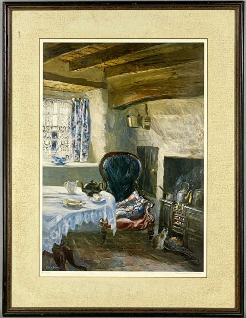 KEITH ANDREW (b. 1947) limited edition (476/750) colour print - interior of cottage with Victorian armchair by cooking range, signed, numbered, and dated 1987 in pencil, 56 x 40cmsProvenance: private collection ConwyComments: framed and glazed