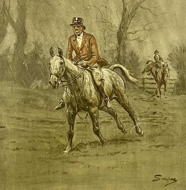 CHARLES ‘SNAFFLES’ JOHNSON PAYNE (1884–1967) Edwardian colour print - 'Merry England and Worth a Guinea a Minute', signed in pencil, 43.5 x 39cms, and Cecil Aldin (1870-1935) colour print - 'The Belvoir: Into the Vale from Clawson Thorns', 35 x 50cms (2)Provenance: private collection ConwyComments: both framed and glazed
