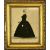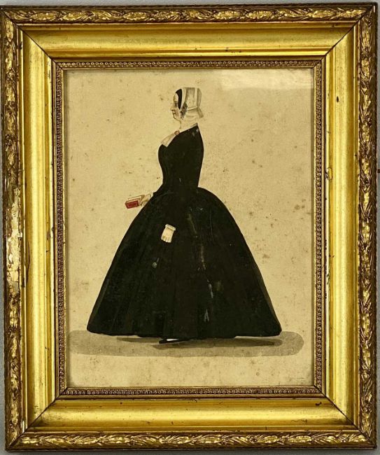 VICTORIAN HIGHLIGHTED SILHOUETTE being a full portrait profile of lady in black dress with white bonnet, holding a book, 26 x 20cms
