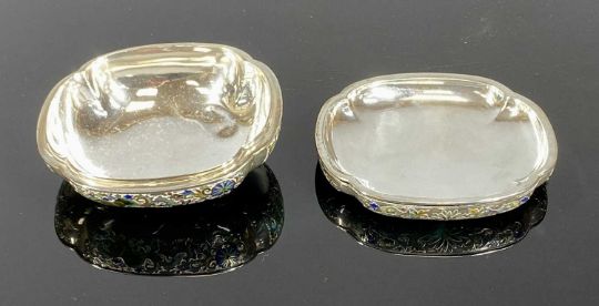 CHINESE OVAL BOX & COVER with re-entrant corners, enamelled and with pierced cover, 4 (h) x 10 (w) x 9cms (d), and an Eastern white metal oval box with hinged cover, ornately chased and engraved, 13cms (w)Provenance: private collection Conwy