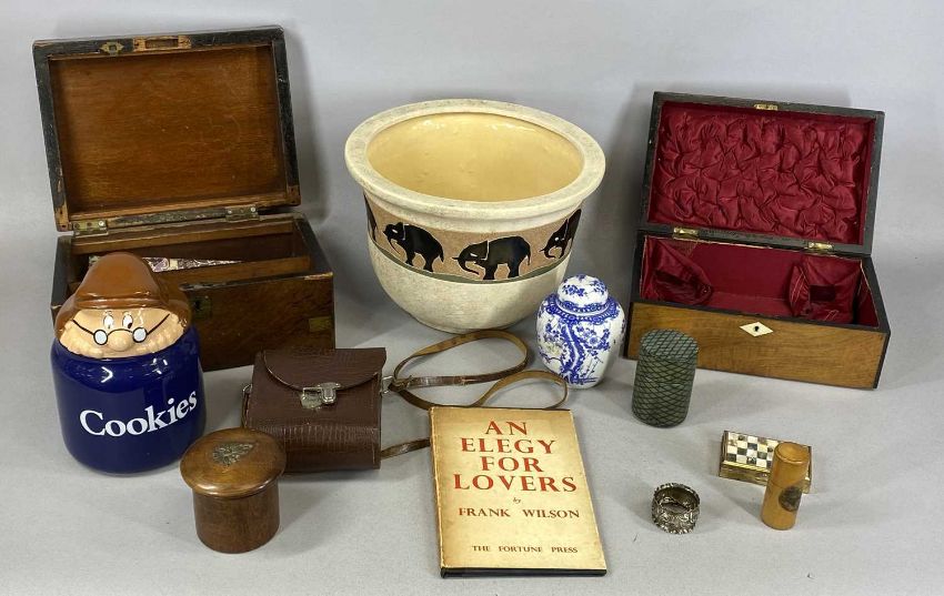 ASSORTED COLLECTABLES, including horn beaker with silver rim in leather travel case, two 19th century walnut trinket boxes, Mauchline ware needle case, inlaid musical compact, etc.Provenance: private collection Conwy