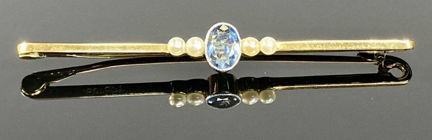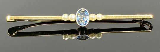 15CT GOLD & PLATINUM BAR BROOCH, set with oval aquamarine and seed pearls, 50mms (l), 2.5gms, in fitted caseProvenance: private collection Powys