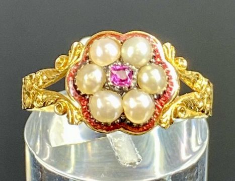 REGENCY YELLOW METAL CLUSTER RING, seed pearls, amethyst, and red enamel, with intricate openwork shoulders, size S, 2.8gmsProvenance: private collection Powys