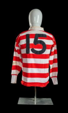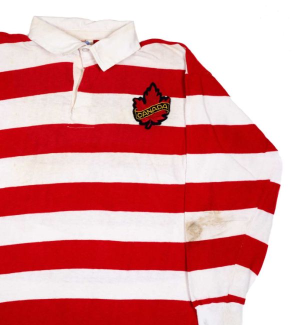 BARRY LEGH | CANADA | 1973The jersey match-worn by full-back Barry Legh in red and white hoops, bearing embroidered maple crest to chest with ‘CANADA’, black number 15 stitched to reverse, Umbro label.This jersey was worn by Legh against a selected Wales XV at the Varsity Stadium, Toronto on June 9th, 1973. Welsh matches against Canada were not at this time categorized as Tests—Welsh players did not receive a cap against Canadian opposition until the 1987 inaugural World Cup. Nevertheless, the team to take on Canada in ’73 was full of star names and prodigious Welsh talent, including JPR, Phil Bennett, Mervyn Davies and Sir Gareth Edwards. JPR had been married for only ten days when he left for the tour.JPR (family notes, 2023):“This jersey is from the Welsh Tour to Canada in 1973. I had played tennis there and travelled with Middlesex and had some good friends in the team. I was lucky as having passed 2nd MB, I had the summer free. Rugby was becoming very popular in the Seventies, particularly in British Colombia (where there were many ex-pats) and we faced the stiffest opposition there. We won all our games, but I thought that 10 years ahead, improving all the time, they would be even tougher. As it happens, it’s quite sad to see the decline of Canada from rugby’s top tier.”