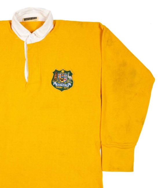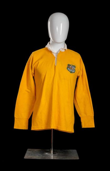 RUSSELL FAIRFAX | AUSTRALIA | 1973Jersey match-worn by Russell Lance Fairfax (b.1952) in traditional ‘gold’ with white collars, embroidered crest to shield badge bearing ‘Australia Rugby 1972’, green vinyl No.15 stitched to reverse, bears collar label for Westmont.Russell Fairfax was a wonderfully precocious talent who played his first representative rugby while still at school but transferred to rugby league when at his height. A tall, athletic, long blond-haired fullback / fly half, Fairfax exuded brilliance as a silken runner with good pace and a classic swerve. He was safe under the highball, tackled well above his weight, and had the ability to create both time and space for his outside supports. Fairfax won eight caps for the Wallabies between 1971 and 1973.JPR did not face Australia in 1972, but it was thought by his family that the jersey was swapped when the players faced each other in the East Wales v Australia clash in October 1973. In this match the Australians used squad numbers (Fairfax was No.26) it is assumed that Fairfax brought the jersey with him to swap with JPR.JPR (family notes, 2023):"I think the no 15 jersey could be from Russell Fairfax. He had burst onto the scene with gusto, and you couldn’t miss him with his long (longer than mine!) fair hair, great pace and style. I had played against him in the East Wales match".Additional playing days images courtesy of Colorsport (Copyright)