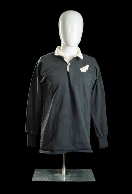 DOUG ROLLERSON | NEW ZEALAND | 1980Traditional All Blacks International Rugby Union match-worn jersey in black with white collar, embroidered ‘silver fern’ and printed number 15 to reverse, Canterbury label to inside collar. In good condition, some inevitable wear to printed number.Believed to have been worn by full-back D L Rollerson (1953-2017) in their emphatic victory against Wales, November 1st, 1980.Rollerson played 24 games for the All Blacks, including eight tests, between 1976 and 1981. Rollerson won the Ranfurly Shield with Manawatu in 1976, kicking the match-winning drop goal as the province won the 'Log of Wood' for the first time. He played 91 games for Manawatu. Rollerson played against South Africa in the controversial 1981 Springbok tour of New Zealand. In the third and deciding test he alternated the goal kicking with fullback Allan Hewson. Rollerson being a right footed kicker took the penalties and conversions from the left-hand side of the field and Hewson, being left footed kicked from the right-hand side. The All Black narrowly won the series 2-1.In 1982, aged 28, he signed to play two seasons of rugby league with North Sydney, where he was a clubmate of Kiwis great Mark Graham.