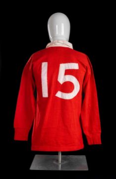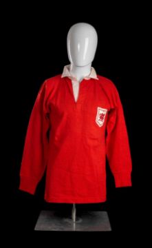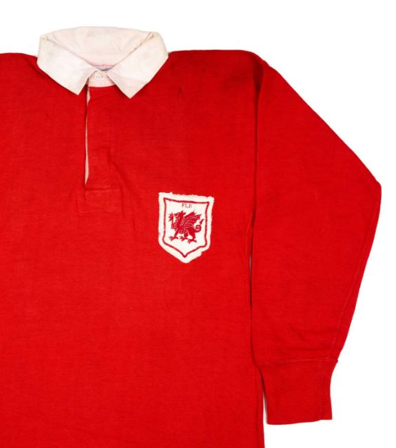 JPR WILLIAMS | WALES UNDER 25 | 1970Red jersey with white collar, Umbro International Sportswear manufacturing label, printed Umbro motif to back, felt patch number 15 stitched to rear with felt patch rampant dragon and embroidered 'FIJI' over.JPR played full-back wearing the number 15 jersey for Wales (Under 25) XV v Fiji at National Ground Cardiff on 21st November 1970. The Wales (Under 25) XV won 8-6. Please see Welsh Brewers Annual 1971/72 page 20 photo of Welsh players in the match wearing this jersey.The Wales line-up was an impressive one, with full-cap players included such as John Bevan, Derek Quinnell, Terry Cobner and was captained by Phil Bennett. The senior Welsh side had earlier in the year shared the Five Nations Championship with France. The match against Fiji would have formed preparation for the 1971 Championship, with the opportunity for selectors to observe a number of ‘possibles’ whilst playing with more experienced ‘probables’ such as JPR. Four months later Wales would win their 6th Grand Slam.