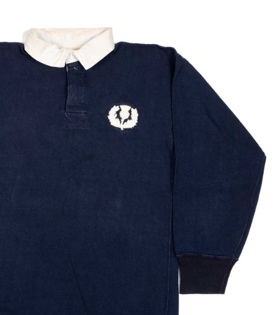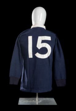 I S G SMITH | SCOTLAND | c.1970 The jersey in navy blue with white collar, stitched Scottish thistle crest, vinyl number 15 to reverse, label for Umbro and for R W Forsyth dating the jersey to late 1969-70 printed Umbro label to hem.Believed to have been worn by Ian Smith (b.1944) against Wales at Cardiff Arms Park on February, 1970. A match Wales won 18-9.Born in Dundee, Smith was raised in Morningside, Edinburgh, and attended George Heriot's School. He would practise his kicking as a schoolboy with George Watson's College pupil Ian Robertson, later a Scotland teammate. A University of Edinburgh dentistry graduate, Smith competed in the varsity first XV and played rugby in the services. He was a captain in the Royal Army Dental Corps, at one point stationed in Germany.Smith, normally a fullback but sometime winger, played 15 against Wales in 1970. He gained his first Scotland call up out of the London Scottish thirds, having come to the attention of selectors playing for Combined Services. On debut at Murrayfield in 1969, Smith scored all his team's points in a 6–3 win over the Springboks, including the match-winning try with five minutes remaining, set up by childhood friend Robertson. He played in Scotland's 1970 Calcutta Cup win over England and finished his two years in the team with eight caps. In 1972, Smith turned out at the Asian Championships with Hong Kong, where he had been posted. He was selected for the 1966 Lions tour to Australia and New Zealand, though he did not play in the Test matches. Smith, by his own admission, was not the fastest back, as highlighted by the title of his autobiography ‘A Full Back Slower than your Average Prop’. But Smith had finishing ability and earned a reputation as a reliable and hard-working player.