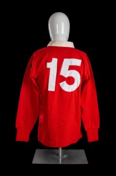 JPR WILLIAMS | LONDON WELSH | 1968-1976Match-worn jersey in red with white collar, bears felt shield with red dragon embroidered crest to white shield shaped badge, canvas number 15 stitched to reverse, Umbro International label to the interior.JPR’s first season for London Welsh was 1968-69 whilst he commenced studying for medicine at St Mary’s. In his autobiography of 1979, JPR devotes a chapter to ‘The Golden Days of London Welsh’ when the club "...made a name for themselves with their exciting fifteen-man ball-handling game". He reflected on his amazement at the fitness of the players – even in the forwards, and, seeing that he was just out of school, had "great difficulty in keeping up with some of these old men".An Evening News report after JPR’s debut on October 5th, 1968, tells of resentment in Wales on JPR’s decision to play for the club. JPR expressed his incredulity "…a round trip of 350 miles to appear for Bridgend is not the best preparation for a game and the problem was further complicated as David Griffiths, the Bridgend vice-captain, is also a full-back". The report tells of JPR’s ‘sensational debut’ for London Welsh.Only a few games into JPR’s first season in 1968, they played his local club Bridgend. JPR admitted that this would be a difficult fixture for him emotionally, particularly as he had already played some matches for the Welsh club. The great Tony Lewis reported on the fixture with the headline 'Williams too good for his ex-colleagues' going on to say that "…whichever side John Williams had played they would have won…his Argentine experiences have clearly injected timing and assurance into his running from full-back".The London Welsh club of the 1960s and 1970s was the go-to for Welsh boys who were either teaching or learning to teach in London. The home matches would bring in big crowds, always confident of a win and some exciting running rugby. At Old Deer Park, JPR was able to bond with fellow Welsh internationals, Mervyn Davies, Tony Gray, John Dawes and John Taylor – who was to be JPR’s best-man. An impressive six of the London Welsh team were selected to tour New Zealand in 1971 with the British Lions. A huge tribute to the club. Together, the London Welsh international players would travel west for their Wales Sunday squad sessions at Aberavon Beach and for Wales matches and so a strong bond was forged between the London Welsh contingent, which was important for the success of the Welsh international side.The entertaining play of London Welsh had its critics, especially from back over the Severn Bridge. Probably from a position of jealousy and snobbery, London Welsh were accused of "being airy-fairy and not tough enough to play proper rugby". But those who watched them play regularly in the early to mid-1970s were enthralled by rugby being played with freedom and expression.JPR reflected that "I will always look back on my days there (London Welsh) as being the most formative in my process of learning to adapt my game to full-back play. This had become my trademark by this time. So, my memories of both the club and people connected with it are fond and grateful ones".Additional playing days images courtesy of Colorsport (Copyright)