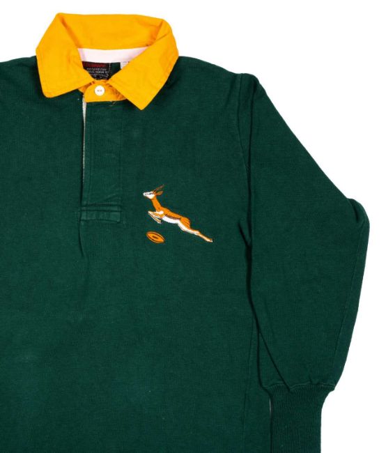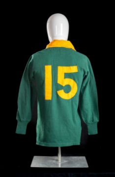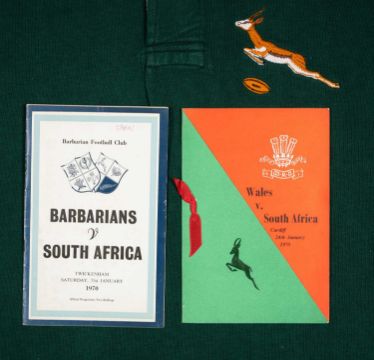 TONIE ROUX | SOUTH AFRICA | 1974Springbok jersey match-worn traditional green with yellow collar, embroidered leaping Springbok, yellow canvas number 15 stitched to reverse, label for Maxmore. Size 38. To accompany:Programme Barbarians vs. South Africa, 31st January 1970, every member of the Barbarians and South African sides have signed it in red ink (good condition).Wales vs. South Africa dinner card, 24th January 1970, internally lists the Welsh team then the menu, toasts, etc. (good condition).A smaller Springbok jersey so would have fitted Ian McCallum or OA Roux (b.1947) during the British Lions series of 1974 but JPR’s family believe the jersey to have been worn by Roux and swapped after the Final Test as would have been the custom. Roux had a 12 stone frame for a size 38, as opposed to de Villiers’ much larger frame.The fourth and final test was a match of high drama which proved to be the best of the series. The match ended in a draw 13-13.JPR (family notes, 2023):"We had played to our strengths in the first two tests on the ‘74 Lions tour. The first test was in Cape town in the mud and we won narrowly through our forwards and Gareth. The second test was up in Pretoria, with higher altitude and hard burnt grass, which was why I bandaged my knees to prevent grass burns. There was always a bit of bandage left over to keep my hair out of my eyes. It was expected by the SA press that we wouldn’t do well on the high veldt… how wrong they were. Benny and JJ did us proud with their side stepping and skill. I had played with both of them for Wales at junior level (u15, u18) and I knew what they could do. At the end of that match the crowd walked silently away So there was much expectation for us in the 3rd. Test, and much change for the Springboks. It seemed like panic to us. We had heard that they were holed up in their training centre for a week and denied access to newspapers. When the team came running out after a delay in the tunnel, their eyes were popping with adrenaline like raging bulls. So we knew what to expect.Much has been made of the 99 call but most people don’t know it started as 999 .. help! But it was too long. And most people don’t know we only used it twice. Willie-John was a marvellous captain. I would have followed him off a cliff if he had asked me to. He had simply said the ref can’t send the whole team off and do your best. I met the SA second row, van Heerden some 30 years later who told me the punch had made him famous in SA and we shook hands. He was on his way to hand out jerseys to the SA team due to play Wales.After all the rumpus, we went on to play some champagne rugby, with JJ running in a couple of great tries, one of them with me passing the ball back and forth to him. I wasn’t surprised that he could grubber kick ahead so accurately as he was fly-half as a junior. We were elated at the end, arms up in the air, jerseys coming off, and Willie John being lifted up. We went over to the area where our extra supporters were standing to salute them. They were Africans, Indians, Cape Coloureds and had supported us throughout the tour, wanting us to rock the establishment, the apartheid way of life. Much later on we heard from JJ that he had received a letter from Nelson Mandela himself: imprisoned but his importance unknown to us at the time. It was so emotional seeing Pienaar receive the World Cup, 20 years later from Nelson Mandela with all the integrated crowd cheering. I like to think we made a bit of difference."With regards to the final test, JPR did not think the preparation was as good as usual, and Fergus Slattery thought the Lions had taken their eye off the ball;“We had mentally packed our bags “. In fact half of the squad had already left, with only the Test team and reserves left. They were exhausted after three months, mentally and physically. After 21 games unbeaten they needed motivating by Willie-John “ please don’t let it slip now”The Lions faced a determined Springbok side, with Tonie Roux retaining his full back slot wearing this jersey. JPR (family notes, 2023):...the ‘Boks were more together and it was close. The match was played at fast pace on the hard ground at Ellis Park, with a couple of controversial tries. It was hard for Max Baise the referee .He was an honest ref and we liked him but there was no video ref then and has said later that it haunted him that he awarded Roger Uttley’s try early on. But near the end , he disallowed a probable try by Fergus Slattery, fed by me near the line. So that was that - a draw at 13-13.As Fergus said 'the referee is always right'. It was a fitting ending to a memorable tour. Quite a few of that Test side had played 4 tests against NZ in ‘71 and were delighted then to draw the last test, winning the series. But for those same players , who were in the test team drawing the 4 th Test was a bit of a let down. They were unbeaten however : a magnificent team' Tonie Roux played full back and fly-half, known for his kicking ability and great tactical awareness. He played for Transvaal and earned his Springbok debut in 1969. Additional playing days images courtesy of Colorsport (Copyright)