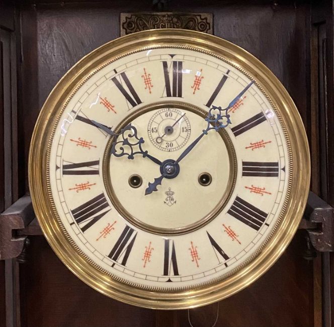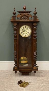 VINTAGE TWIN-WEIGHTED VIENNA CLOCK, enamelled dial, Roman numerals, crown/anchor GB mark, with key and pendulum, 101 (h) x 48 (w) x 20cms (d)Provenance: private collection Conwy