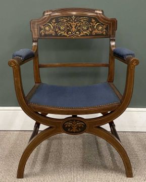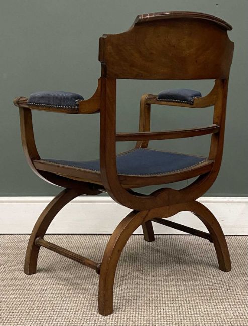 ANTIQUE MAHOGANY X-FRAME ELBOW CHAIR, fine inlay, blue upholstered seat, 87 (h) x 63 (w) x 51cms (d)Provenance: private collection Conwy