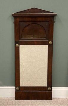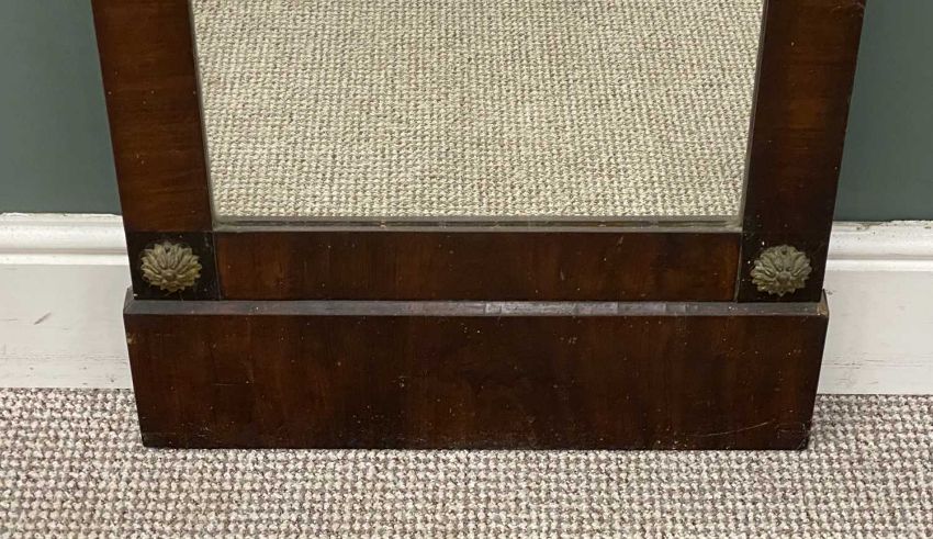 PLAS TEG HOUSE CONTENTS: DECORATIVE STEEPLE-TOPPED TIMBER FRAMED WALL MIRROR, gilt motif inserts, 136 (h) x 58 (w) x 6cms (d)Provenance: The Cornelia Bayley Collection from Plas Teg, an important Jacobean house in Flintshire, North Wales Plas Teg: Once in a Generation Welsh House Clearance — Rogers Jones Co