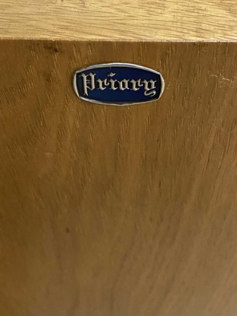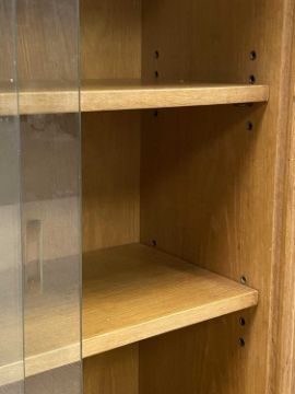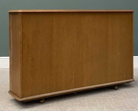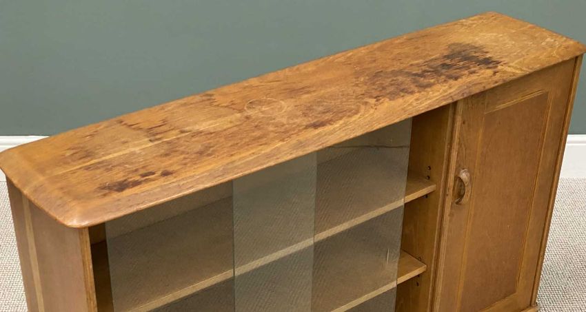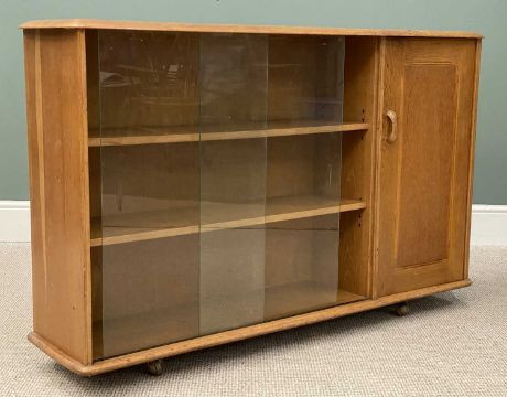 MID-CENTURY BOOKCASE, in the manner of Ercol, with glass sliding doors, labelled 'Priory', 86 (h) x 138 (w) x 35cms (d)Provenance: private collection Wrexham