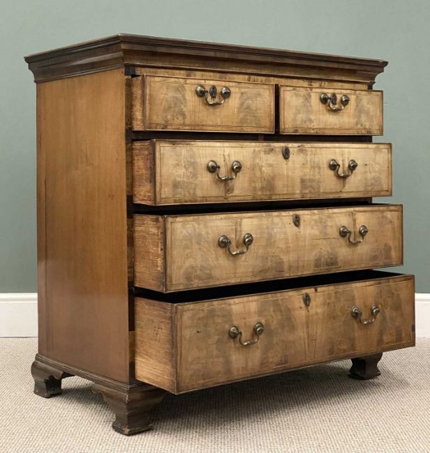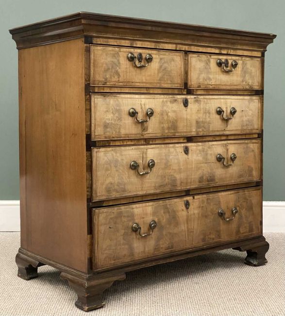 ANTIQUE WALNUT CHEST OF DRAWERS, brass drop handles, string inlay, on bracket feet, 103 (h) x 101 (w) x 55cms (d)Provenance: private collection Conwy
