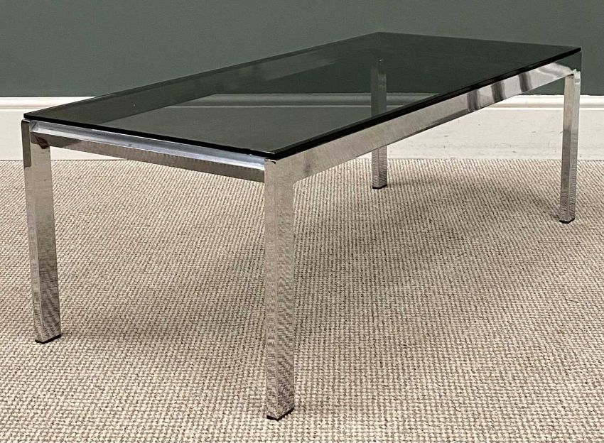 CONTEMPORARY CIRCULAR GLASS & CHROME COFFEE TABLES, nest of three, tallest 54(h) x 50cms (diam.), and similar style Long John coffee table, 38 (h) x 110 (w) x 50cms (d)Provenance: private collection Conwy