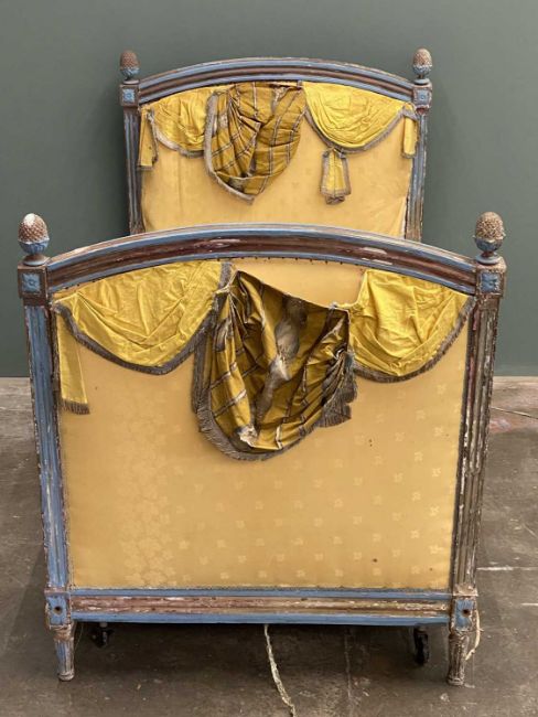 PLAS TEG HOUSE CONTENTS: FRENCH STYLE SINGLE BED, upholstered and carved head and footboard, 140 (h) x 117 (w) x 213cms (d)Provenance: The Cornelia Bayley Collection from Plas Teg, an important Jacobean house in Flintshire, North Wales Plas Teg: Once in a Generation Welsh House Clearance — Rogers Jones Co