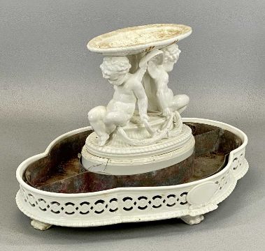 PAIR OF WHITE GLAZED PORCELAIN CENTREPIECES, 19th century, each having twin figures of putti to central column, shaped oval bases with reticulated sides and removable metal liners, 26 (h) x 42 (w) x 30cms (d)Provenance: The Cornelia Bayley Collection from the historic Welsh Jacobean house, Plas Teg, Flintshire. Further details on this important Jacobean house and its clearance Welsh House Clearance of a Generation — Rogers Jones Co