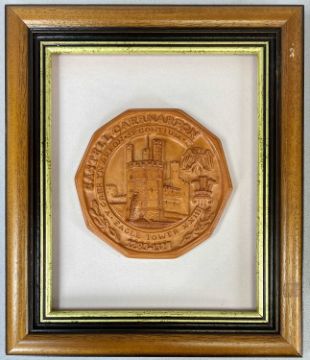 TWO CERAMIC TOKEN PLAQUES, 'Castell Caernarfon' and 'Castell Biwmares', each mounted and contained in a frame, 39 x 34cms overallProvenance: private collection Gwynedd