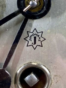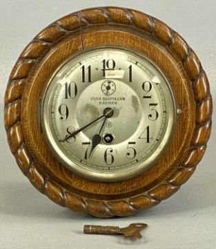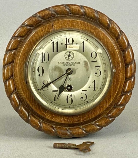 ENO KOOPMANN BREMEN KRIEGSMARINE SHIP'S WALL CLOCK, in carved rope-twist case, silvered dial with black Arabic numerals, Junghans eight day movement, 24cms (diam.)Provenance: Property of the family of Captain Moses James Lee RN, DSC. According to his records the clock was taken from the German coaster SS Leander. When WWII broke out S S Leander was in port at Vigo, Spain. Unable to get food, she attempted to reach Germany disguised as a Soviet merchant ship. She was captured by HMS Cyclops, where Moses James Lee was a First Lieutenant Gunner, and in his records he recounts how clocks were taken off the German ship along with charts and other items.