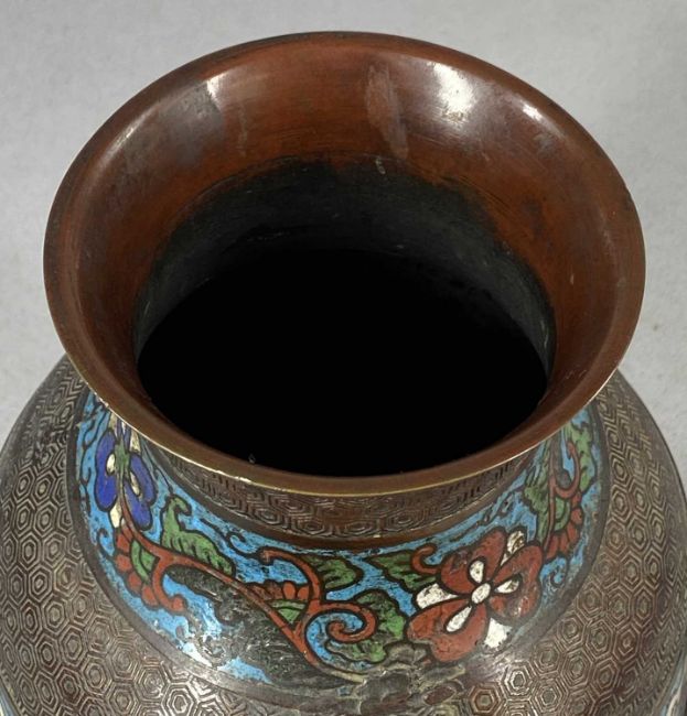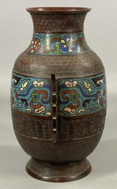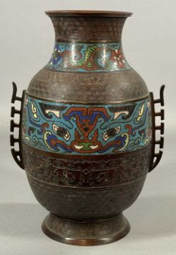 CHINESE BRONZE TWO-HANDLED VASE, with bands of champleve enamel decoration, 30cms (h)Provenance: private collection Conwy