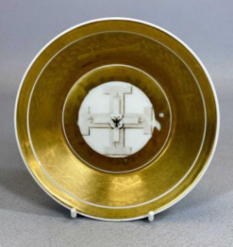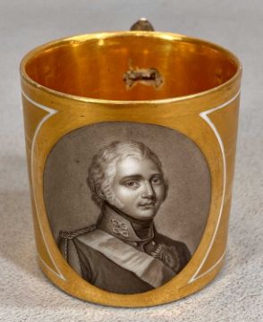 CONTINENTAL PORCELAIN CUP & SAUCER, cup with bat printed portrait of a gentleman, saucer with twin-headed eagle and Maltese cross centre, heavily gildedProvenance: private collection Flintshire