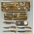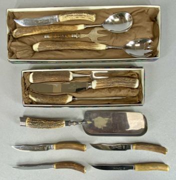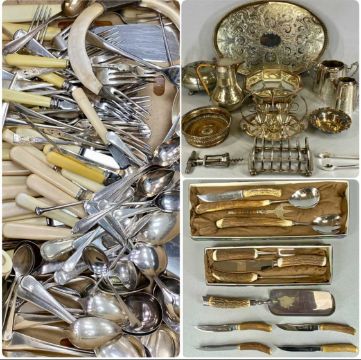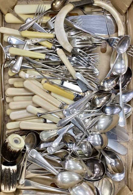 VARIOUS PLATED ITEMS, including oval tea tray, egg cruet, bottle coaster, toast rack, and various cutlery including antler handled, steak knives, crumb scoop, and othersProvenance: deceased estate Denbighshire