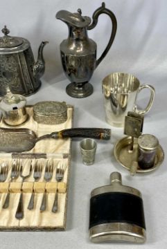 OFFERED WITH LOT 47 - ASSORTED WHITE METAL / PLATED ITEMS, including claret jug, mustard pot, tankards, etc.
