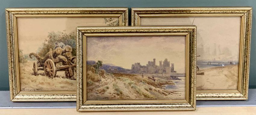 JOHN SINCLAIR (active 1871-1922) 3 x small watercolour studies - all signed, titled verso 'Conwy Castle', 11.5 x 17.5cms, 'The Woodcutter', 13.5 x 18cms, and 'Low Tide', 13.5 x 18cms and a gouache study - birds descending upon a lake, cloud shrouded mountains to the background, labelled verso 'John Sinclair 1871', 26 x 39.5cms