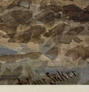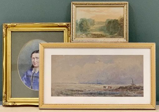 ARTHUR SUKER (1857-1940) watercolour - cattle by a river, signed lower right, 15 x 33cms, G NESHMAN small watercolour - Kensington Palace with sheep to the foreground, possibly signed lower left, 11.5 x 17.5cms, and S HUGGINS watercolour - oval portrait of a woman in a blue dress, signed verso, 19 x 14.5cms