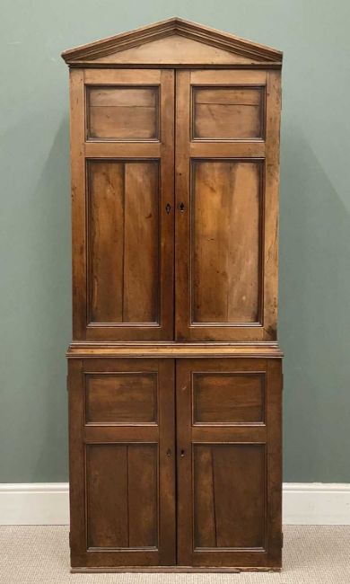 VINTAGE PINE BOOKCASE CUPBOARD, the twin door top having steeple cornice and multi shelves, on a two-door base, 199 (h) x 78 (w) x 36cms (d)Provenance: deceased estate Conwy