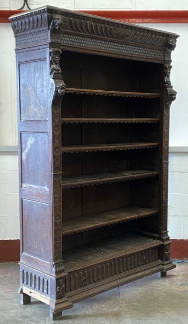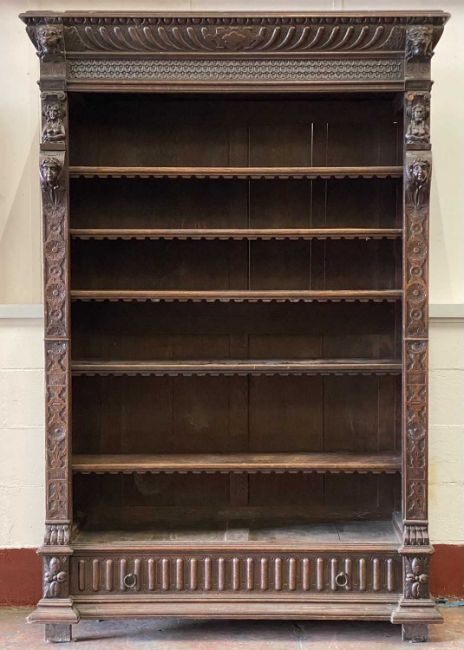 GOTHIC REVIVAL OAK BOOKCASE, a fine example, carving throughout, six shelves over a base drawer, 216 (h) x 143 (w) x 47cms (d)Provenance: private collection Conwy