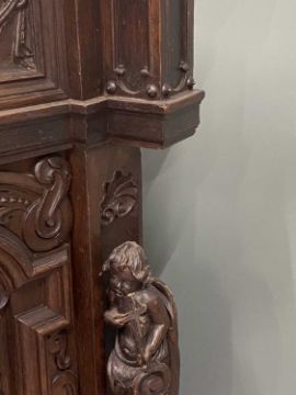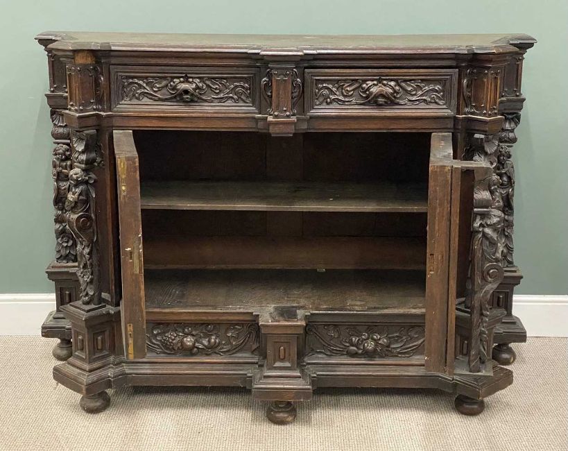 FLEMISH GOTHIC REVIVAL OAK DINING ROOM SUITE comprising two door sideboard, 120 (h) x 178 (w) x 70cms (d) and a fine oak dining table, 77 (h) x 200 (w) x 107cms (d) with six, believed leather covered chairs, paw feet and heavily carved throughout