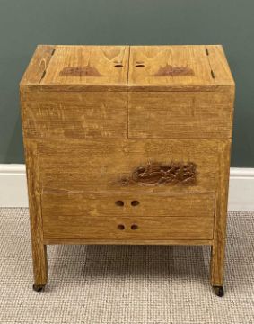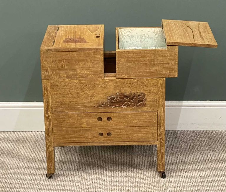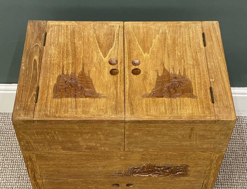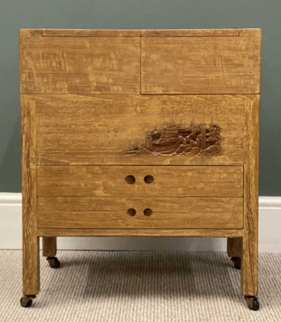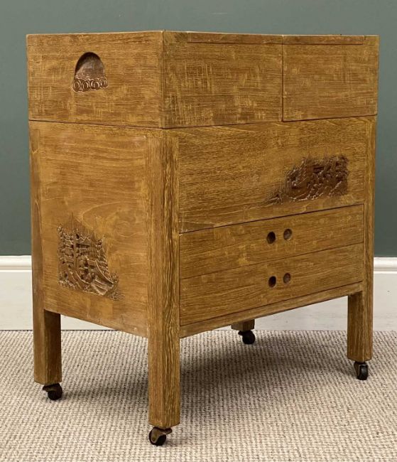 LIGHTWOOD CHINESE CARVED WORKTABLE having sliding and lift top above two drawers and on castors, 66 (h) x 56 (w) x 35cms (d)Provenance: private collection Denbighshire
