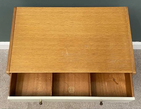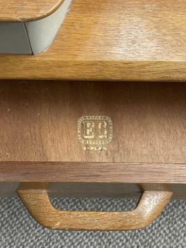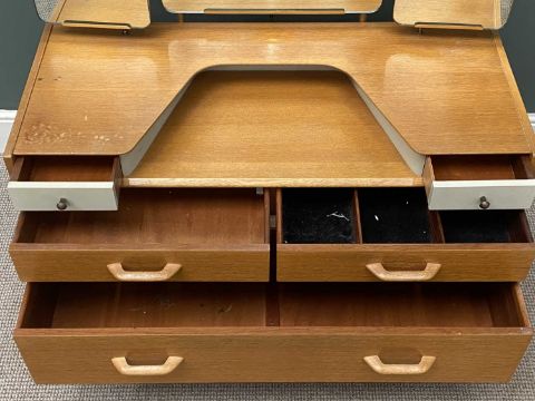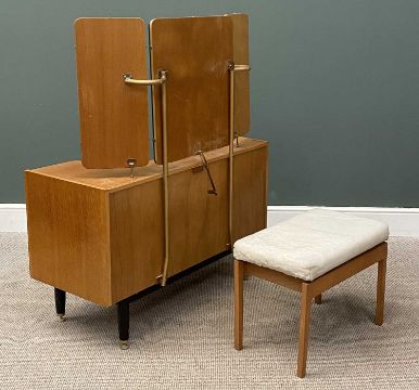 MID-CENTURY G-PLAN E GOMME LABEL BEDROOM FURNITURE to include two door wardrobe with central bi-fold mirror, 171 (h) x 122 (w) x 56cms (d), a multi-drawer dressing chest, 127 (h) x 107 (w) x 46cms (d), stool and a five drawer chest, 98 (h) x 76 (w) x 46cms (d)