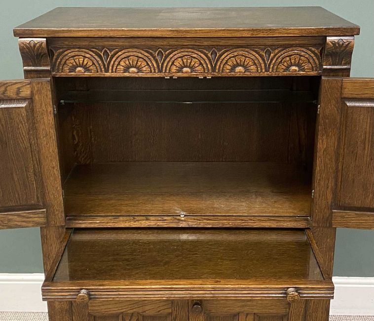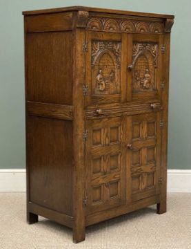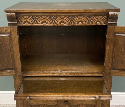 FLEMISH STYLE OAK CARVED CABINET having two cupboard doors over a base of two cupboard doors and central slider, 125 (h) x 81 (w) x 46cms (d)Provenance: deceased estate Denbighshire