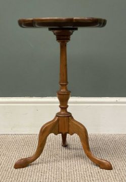 BURR WALNUT ON MAHOGANY SHAPED TOP, TRIPOD WINE TABLE, 50 (h) x 31cms (diam.)Provenance: private collection Ynys Môn