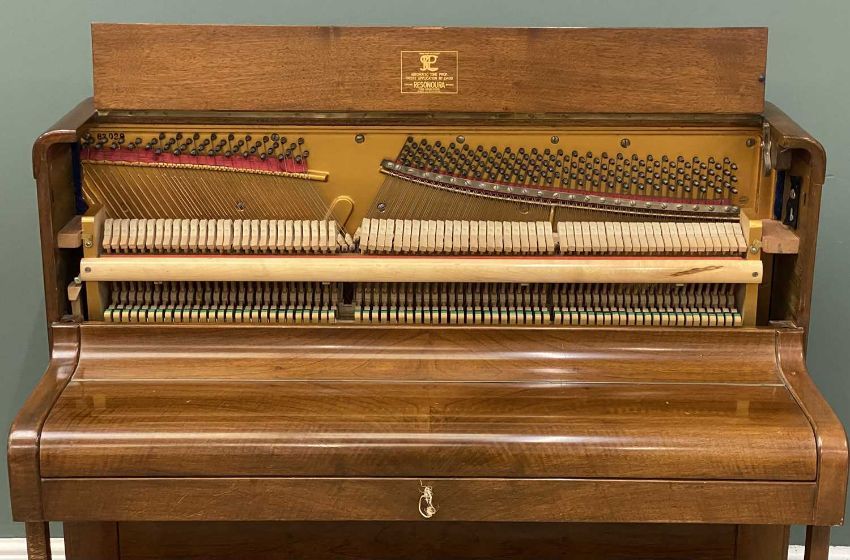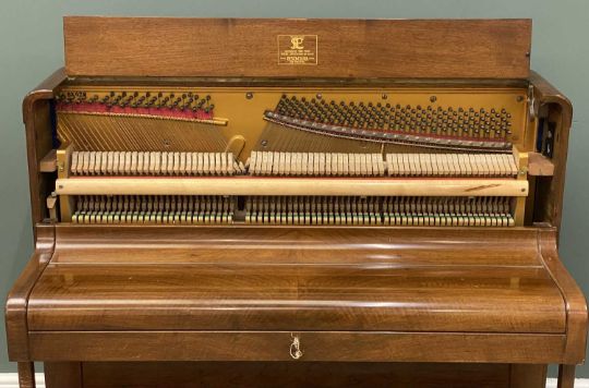 VINTAGE COMPACT MAHOGANY/WALNUT CASED 'BENTLEY' UPRIGHT PIANO, overstrung, Resonoura soundboard, 110 (h) x 120 (w) x 53cms (d)provenance: deceased estate Conwy
